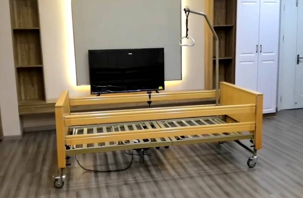 This home care bed is easy to transport and assemble, featuring a four-sectioned mattress support for adjustable height combinations, ensuring comfort for the user and ease for the carer. Made with a durable steel frame and coated surface, it includes a non-slip wooden bed board, a beechwood style headboard, and aluminum side rails. The 4-inch casters with brakes allow easy movement, while the three-motor system and five-function manual controller offer precise adjustments for optimal care.